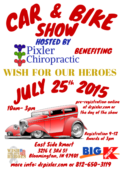 Pixler Chiropractic is teaming up with WISH for OUR HEROES for the 1st Annual Car and Bike show held on Saturday, July 25th, 2015 from 10 A.M. to 3 P.M. WISH for OUR HEROES is a national 501(c)(3), dedicated to assisting the men and women of the United States active-duty military. The founders of WISH for OUR HEROES served on active-duty and while deployed, they recognized that a serious need existed within our military ranks. There were no charities that focused on not only helping military members falling into these extreme categories, but also helping the average, hard-working military member going through a difficult time. WISH for OUR HEROES started with the goal of providing one wish for every deserving military member. Their priority is to always grant basic needs or emergencies first - anything from putting food on the table to assisting with car repairs, home repairs, baby supplies, clothing, etc. When basic needs are met, they also enjoy providing fun things like sending the troops to athletic events, sending them on vacation to get re-acquainted after deployments, meeting celebrities and more.